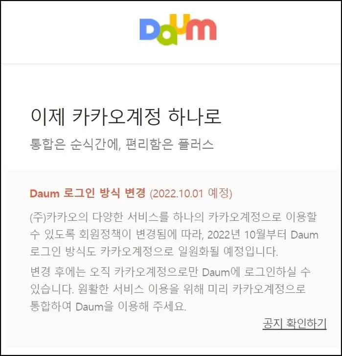 포털사이트 다음(Daum) 계정이 카카오 계정과 합쳐집니다.
