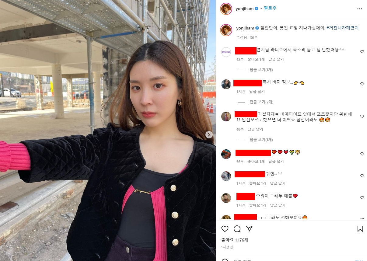 함연지는 사진과 함께 "잠깐만여. 못된 표정 지나가실게여"라고 글을 남겼습니다.