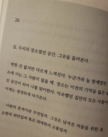 책에는 "누군가와 늘 함께였던 장소에 더는 그 사람이 없을 때 장소는 이전의 기억을 잃은 낯선 공간이 되어 나를 반긴다" "익숙했던 집안의 모든 사물이 생경하게 다가온다" "사람의 흔적이란 무엇일까" 등의 내용이 이어지고 있습니다.