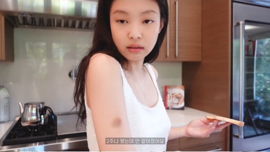 제니는 토스트를 먹으며 "아침식사 후에는 보통 집을 치운다. 오늘은 날이 좋아서 산책해도 될 것 같다"라고 말하다가 팔에 멍이 든 것을 가리키며 "핼러윈 주간에 LA에 왔는데 친구들이랑 귀신의 집 여러 군데를 갔다. 악몽이었다"라며 고개를 저었는데요.
