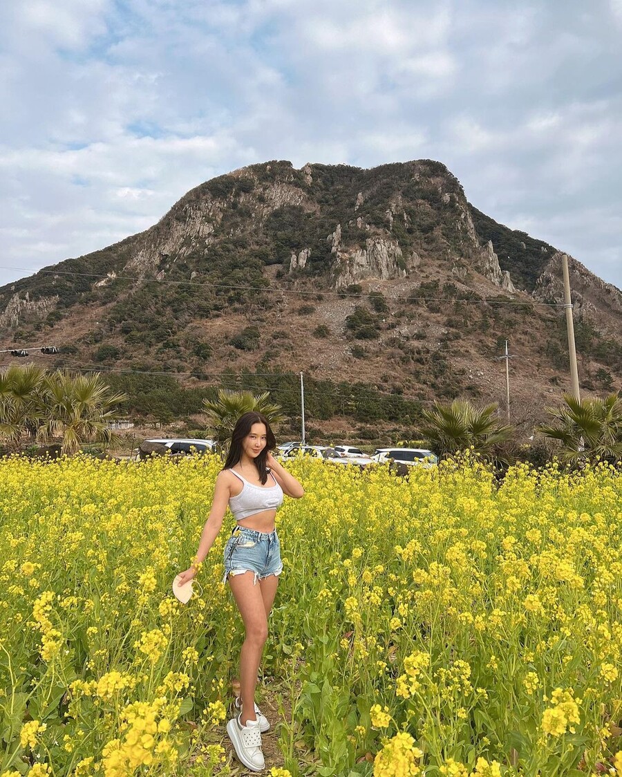 이수진은 "유채꽃밭 인증샷 이렇게 찍는 거라고 배웠다"라며 브라톱, 짧은 청반바지를 입고 찍은 유채꽃밭 인증샷을 공개했습니다.