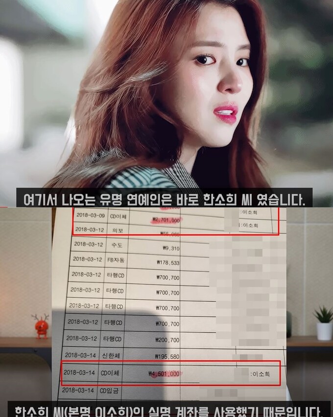 신 씨가 돈을 빌리는 과정에서 딸 한소희의 실명 계좌를 사용했기 때문이라고 합니다.