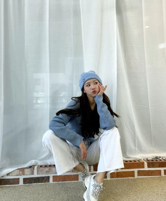 또 다른 사진 속 이미주는 소멸직전의 작은 얼굴에 귀여운 모자를 쓰고 여러 포즈를 취했습니다.