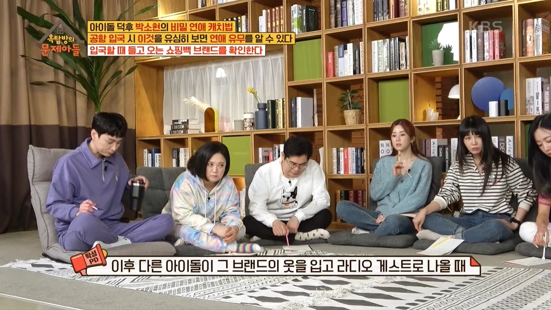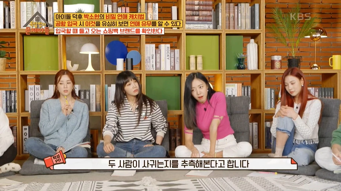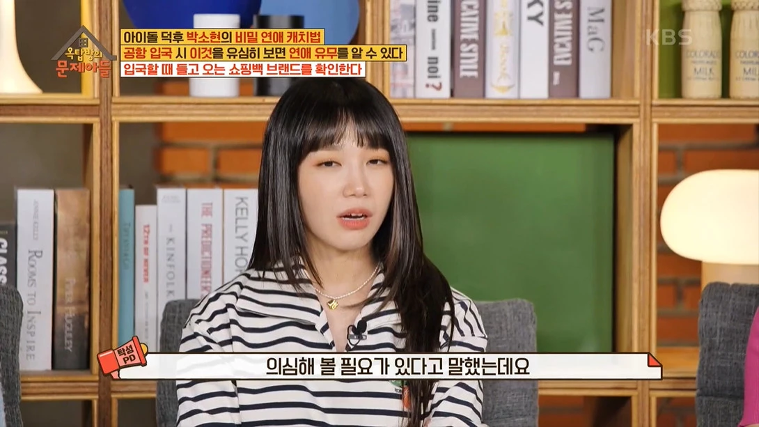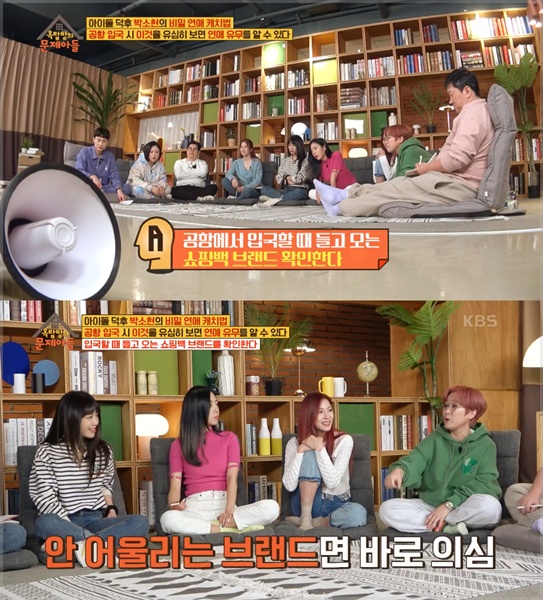 KBS2 예능프로그램 옥탑방의 문제아들에 "자타공인 아이돌 덕후 박소현이 아이돌 비밀 연애를 캐치하는 방법이 있다고 한다. 아이돌이 공항에서 입국할 때 이것을 유심히 살펴보면 현재 연애 중인지를 예측할 수 있다고 하는데 무엇일까?"라는 문제가 출제되었습니다.