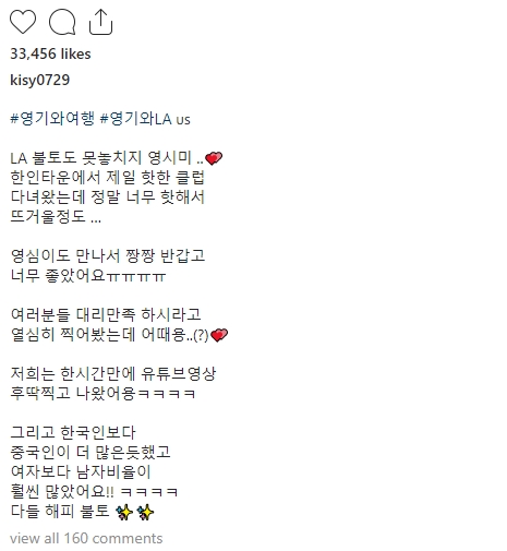 홍영기는 자신의 인스타그램에 LA 불토도 못 놓치지 영시미.. 한인타운에서 제일 핫한 클럽이라는 글과 함께 사진을 게시하였습니다.