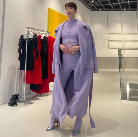 사진 속 조권은 연보라색의 레깅스에 크롭티와 코트를 깔맞춤한 모습이었습니다.