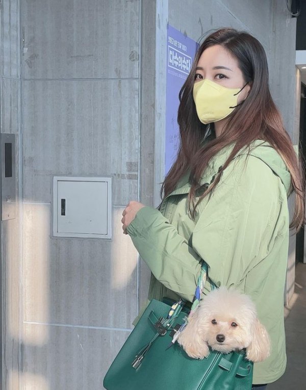 연두색 야상에 노란빛 마스크, 초록색 명품백을 매치해 남다른 패션센스를 뽐냈습니다.