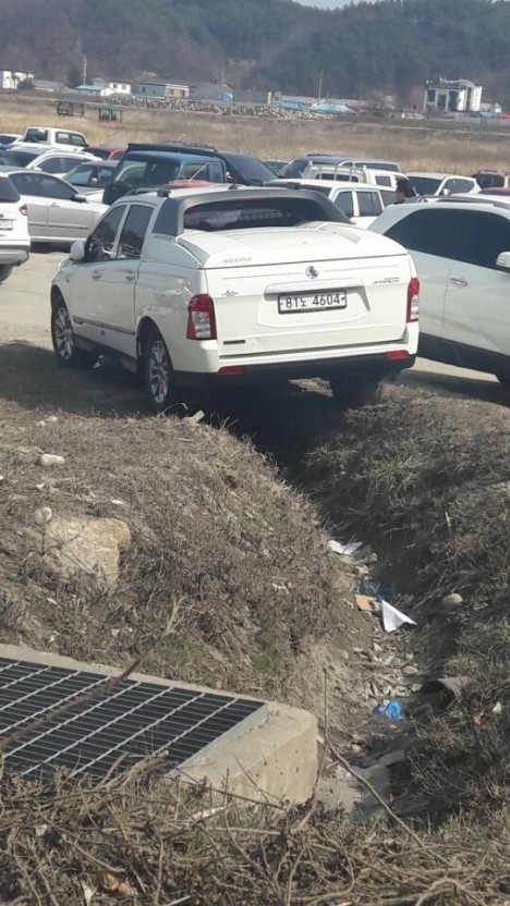 사진 속 SUV 및 승합차, 트럭 등의 뒷바퀴가 옹벽 끝에 아슬아슬하게 걸쳐져 있는데요.