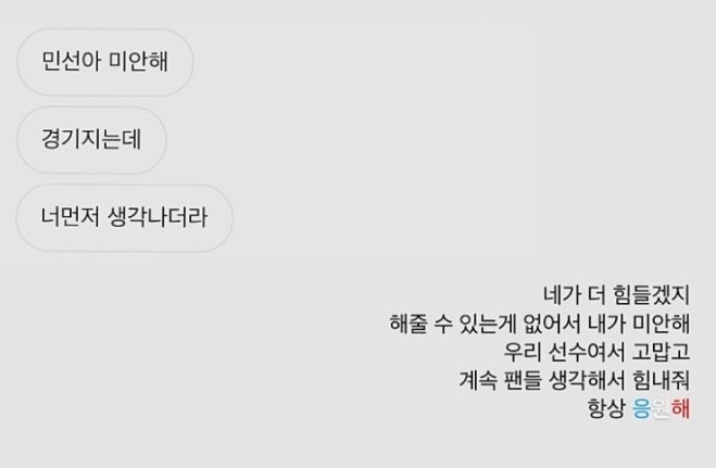 공개된 DM 속에는 남성으로 추정되는 사람이 "민선아 미안해. 경기 지는데 너 먼저 생각나더라"는 메세지를 보냈고 이에 곽민선은 "네가 더 힘들겠지. 해줄 수 있는 게 없어서 내가 미안해. 우리 선수여서 고맙고 계속 팬들 생각해서 힘내줘. 항상 응원해"라는 답을 보냈습니다.