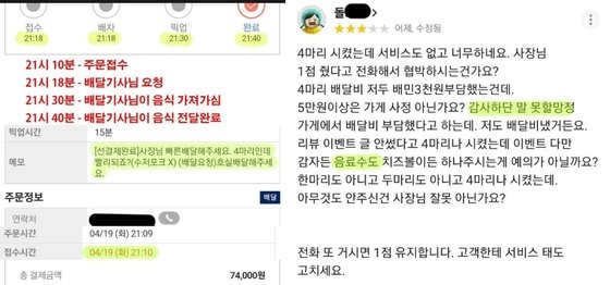 고객에게 치킨 4마리를 주문받아 배달을 해주었는데 주문 사항 외 서비스를 주지 않은 이유로 고객에게 별점테러를 받은 사연이 공개 되었습니다.