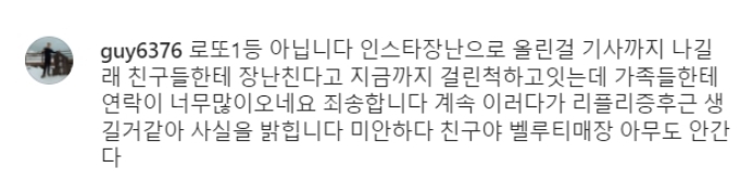로또 1등에 당첨됐다고 주장한 지 불과 이틀 만에 사실이 아니라고 해명하며 장난으로 일어난 해프닝으로 끝이 났습니다.
