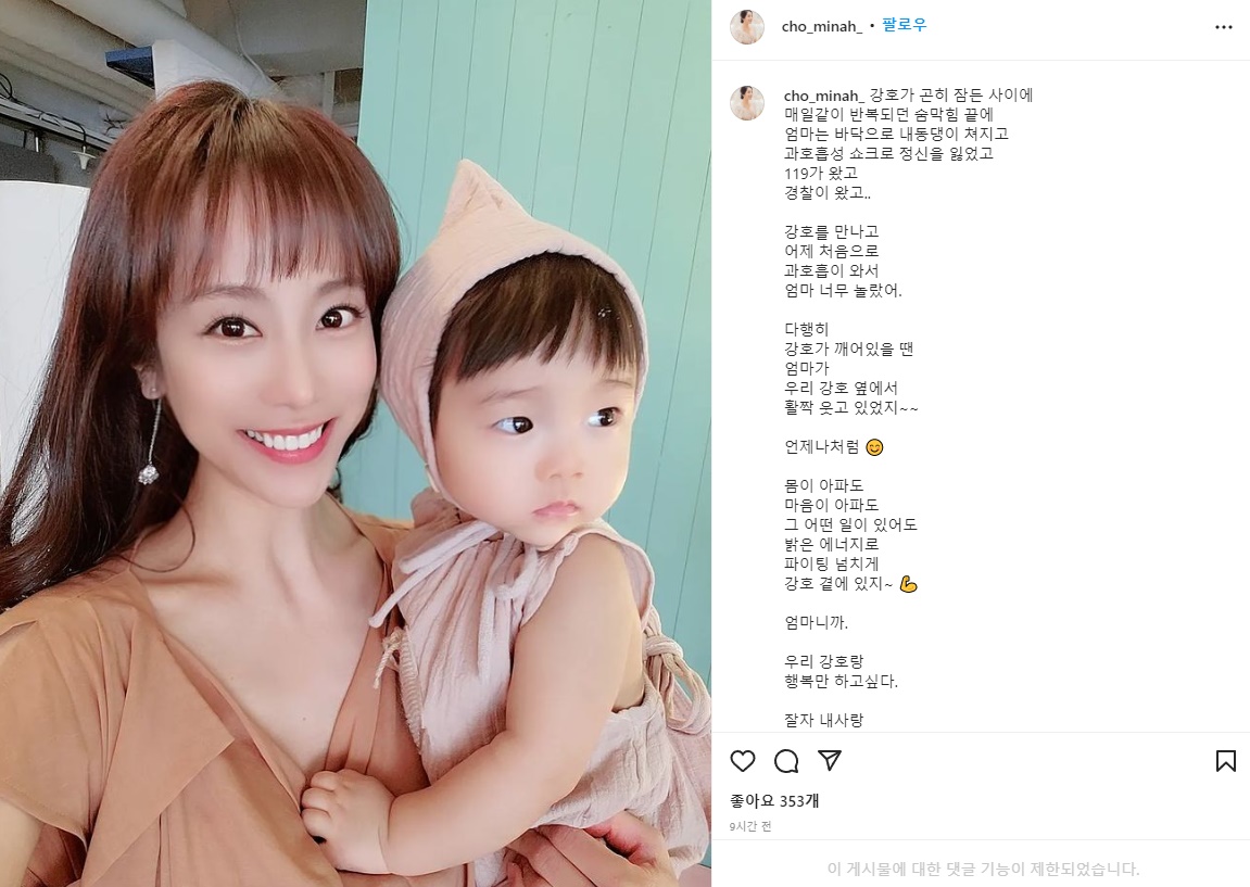 또 "다행히 강호가 깨어있을 땐 엄마가 우리 강호 옆에서 활짝 웃고 있었지 언제나처럼. 몸이 아파도 마음이 아파도 그 어떤 일이 있어도 밝은 에너지로 파이팅 넘치게 강호 곁에 있지”라며 “엄마니까. 우리 강호랑 행복만 하고 싶다. 잘자 내사랑 내아가 내우주 내보물”라며 #엄마보호받고싶다”라는 해시태크를 덧붙였습니다.