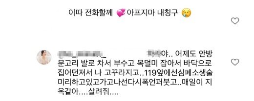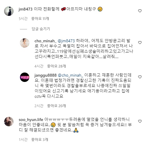 이 같은 글에 조민아의 친구가 “이따 전화할게. 아프지마 내 친구”라는 댓글을 달자 조민아는 “어제도 안방문고리 발로 차서 부수고 목덜미 잡아서 바닥으로 집어던져서 나 고꾸라지고.. 119앞에선 심폐소생술 미리하고 있고 가고 나선 다시 폭언 퍼붓고.. 매일이 지옥같아... 살려줘”라는 답글을 달았는데요.