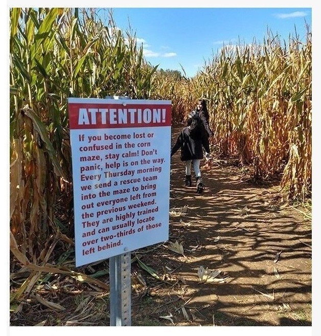 옥수수밭 미로에서 길을 잃어도 당황하지 말고 침착하십시오.