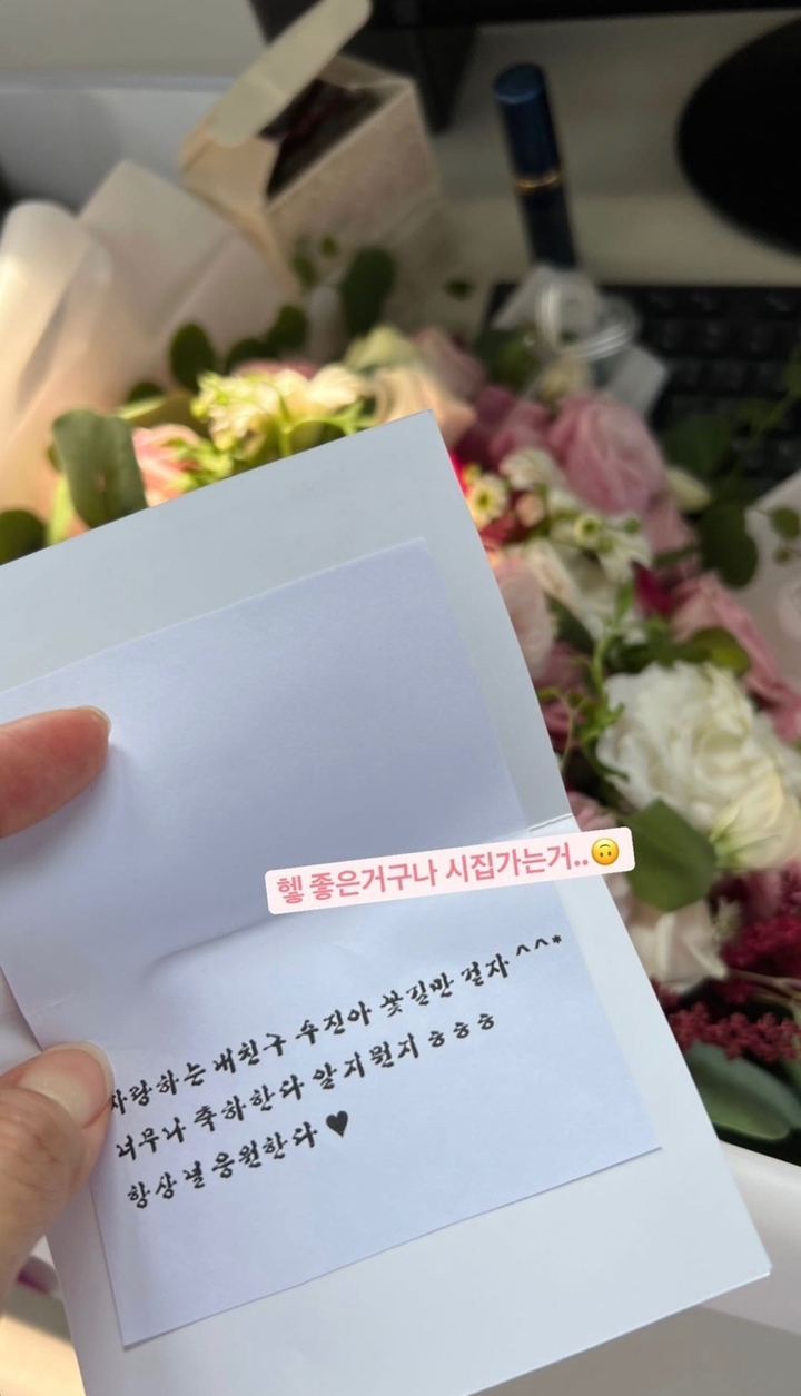 편지에는 "사랑하는 내친구 수진아 꽃길만 걷자^^ 너무나 축하한다 알지 뭔지 ㅎㅎㅎ 항상 널 응원한다"라고 쓰여져 있었습니다.