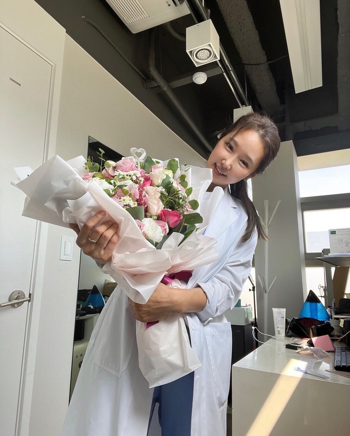 공개된 사진속 이수진은 병원으로 추정되는 곳에서 의사 가운을 입고 큰 꽃다발을 든 채 미소를 짓고 있는 모습이 담겨 있었습니다.