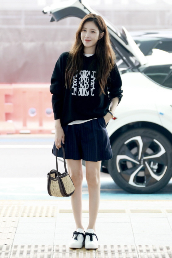 이지아는 이날 블랙 핫팬트에 청자켓을 걸치고 모자를 쓴 꾸안꾸 스타일을 선보였는데요.