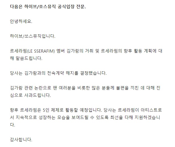 또 향후 르세라핌은 김가람이 빠진 5인 체제로 활동할 예정이라며 르세라핌이 아티스트로서 지속적으로 성장하는 모습을 보여드릴 수 있도록 최선을 다해 지원하겠다고 전했습니다.