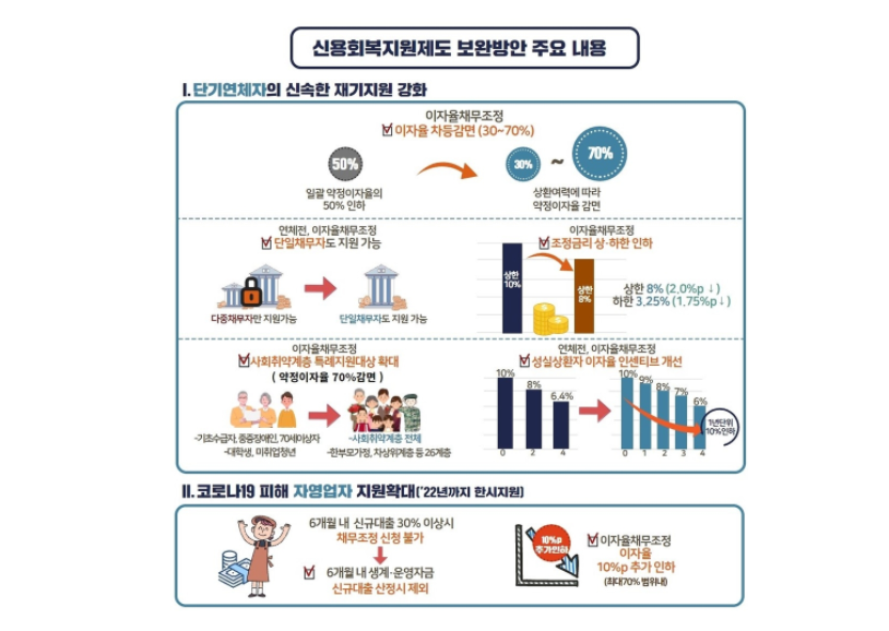 이 방안은 금융위원회가 지난 9월 16일 코로나19 피해 중소기업과 소상공인을 돕기 위해 발표한 조치로, 대출 만기 연장·이자 상환유예 조치를 6개월 연장했음에도 폐업 등으로 어려워진 개인사업자 등 취약 채무자를 지원하려는 목적에서 마련됐다.