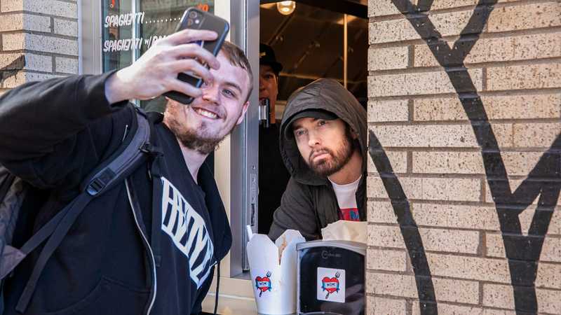 세계적인 래퍼 겸 배우 에미넴(43)이 '엄마의 스파게티(맘스 스파게티)'라는 가게 개업식에 나타나 서빙하는 모습이 포착됐습니다.