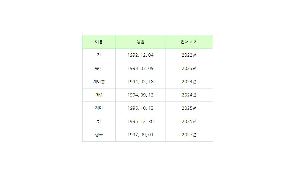 병역 면제를 받지 못할 경우, BTS 멤버의 군대 입대 시기는 아래와 같다.