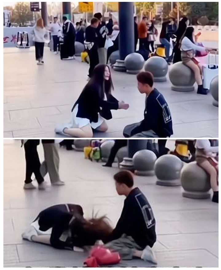 중국 대낮의 도심 길거리에서 한 여성은 무릎을 꿇고 남성에게 울며 애원하는 장면이 포착되어 화재가 되었다.