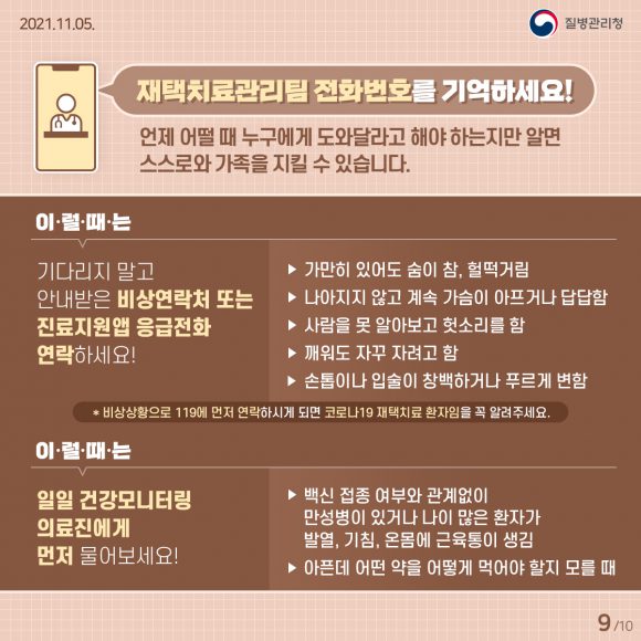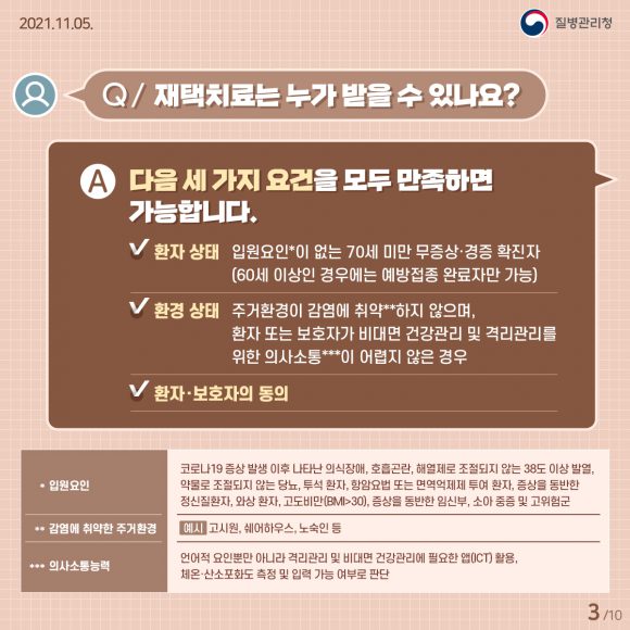 자가 격리는 들어봤지만, ‘재택치료’라는 단어는 비교적 낯설다. 지금까지 재택치료는 확진자가 무증상·경증 어린이·청소년 및 보호자, 성인 1인 가구일 경우 제한적으로 실시됐다. 병상 확충 및 의료진의 양적 부담을 줄이기 위한 대안이었다. 하지만, 질병관리청에서 발표한 「코로바이러스감염증-19」 재택치료 안내서에 따르면 11월 9일부터는 대상 및 기준과 환자 관리 등에서 큰 변화를 보인다.