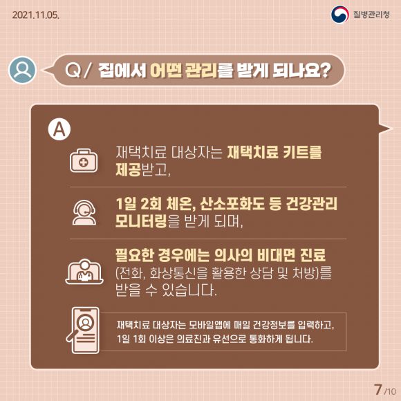 재택치료를 한다고 불안할 필요는 없다. 24시간 배정받은 의료 기관과 통화와 비대면 진료가 가능하며 의사와 비대면 면담 후 처방도 가능하다. 더해, 1일 1회 이상은 의료진과 유선으로 건강 상태 체크를 실시한다.