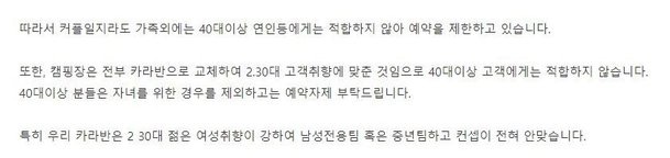 해당 업체는 “카라반은 일반 텐트와 달리 차량용 시설이라 커플, 여성 그리고 정해진 가족에 한해 이용할 수 있다”며 “조용하고 쾌적한 캠핑서비스 제공을 위해 영업손실을 감수하고서라도 취하는 예약 제한”이라고 밝혔다. 업체는 “커플일지라도 가족 외에는 40대 이상 연인 등에게는 적합하지 않아 예약을 제한하고 있다”며 “40대 이상 분들은 자녀를 위한 경우를 제외하고는 예약 자제 부탁드린다”고 했다. 특히 “우리 카라반은 20~30대 젊은 여성 취향이 강해 남성전용팀 혹은 중년팀하고 콘셉트가 전혀 맞지 않는다”고도 강조했다. 그러면서 “방음에 취약한 곳이라 고성방가, 과음으로 인한 문제 등 주변에 엄청난 피해 우려가 있는 경우를 사전 차단한다”며 “대부분 좋은 분들이지만 일부 극소수의 폐해가 워낙 크다”고 공지했다.