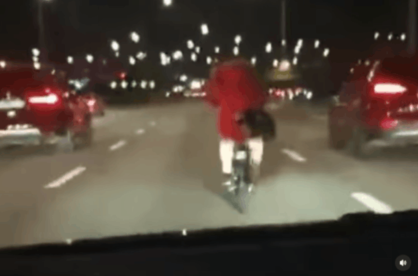 영상을 보면 자전거 운전자는 도로 한복판에서 주변은 신경 쓰지 않고 달리는 모습이다. 영상을 촬영한 차량은 자전거 때문에 제 속도를 내지 못한채 뒤를 따라가고 있지만, 다른 차선의 차들은 빠르게 달려 다소 위험해 보이기도 한다.