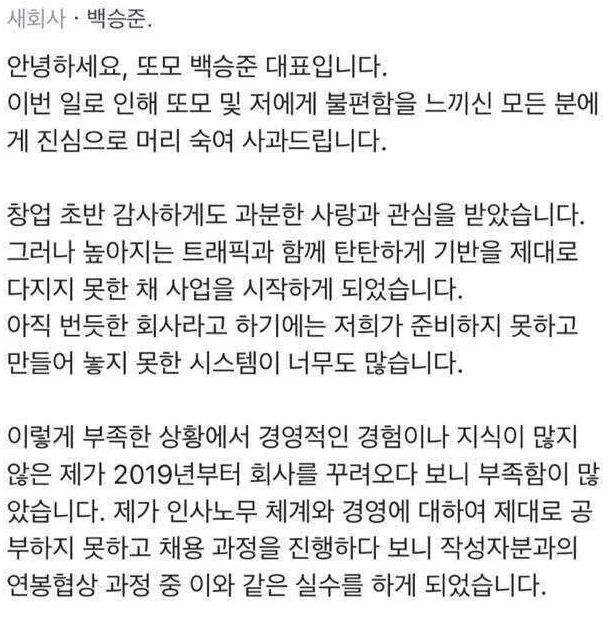 한편 '또모'의 백승준 대표는 7일 유튜브 채널 '또모' 커뮤니티에 "어제 발생한 상황으로 인해 실망과 상처를 입은 당사자분과 구독자분들께 진심으로 머리숙여 사과드린다"며 "모든 것이 저의 과오와 부족함 때문이다. 해명하고자 올린 글로 인해 더 큰 상처를 입으신 당사자분께 다시 한번 진심으로 사과드린다"고 글을 올렸습니다.