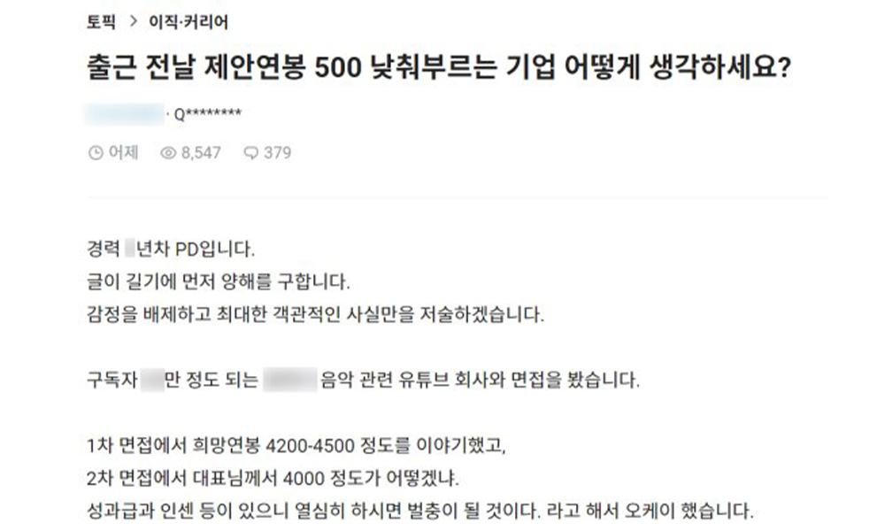 온라인 커뮤니티 에펨코리아에는 '이직 첫 출근 전날 연봉 500만원 인하 통보한 유튜브 채널'이라는 제목의 글이 올아왔는데요.