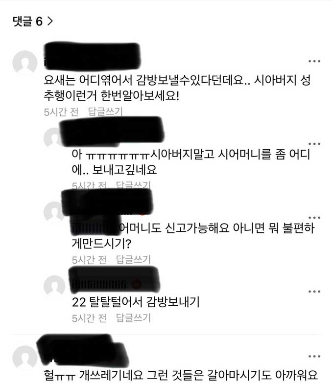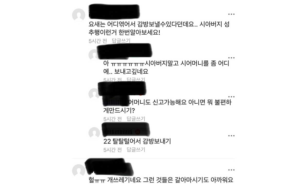 이에 A씨가 “시아버지 말고 시어머니를 좀 어디에 보내고 싶다”는 댓을 달자 다른 회원들은 “시어머니도 신고가 가능하다”며 “아니면 불편하게 만들기”, “탈탈 털어 감방 보내기”, “개XXX” 등 단순 장난으로 보기 힘든 댓글과 욕설이 줄을 이었습니다.
