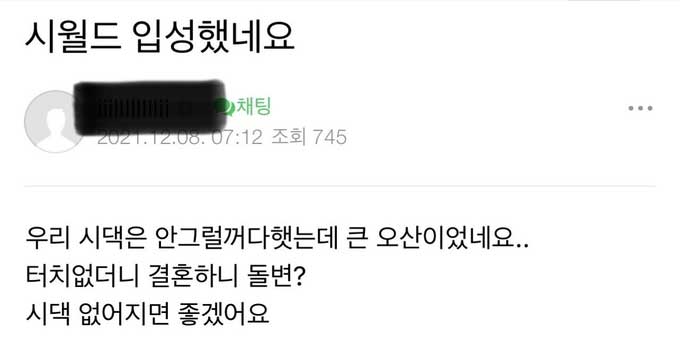 그는 “우리 시댁은 안 그럴 거다 했는데 큰 오산이었다”며 “터치(간섭) 없더니 결혼하니 돌변했다. 시댁이 없어지면 좋겠다”고 하소연 했습니다.