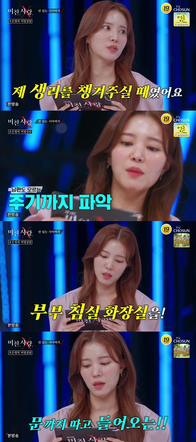 시아버지는 "배가 차서 그러는 거다. 그러니까 주기도 안 맞지"라며 남편도 모르는 사연자의 생리주기까지 파악하고 있었던 것 입니다. 사연을 소개하던 정시아는 "소름돋았다"며 경악을 금치 못했습니다.