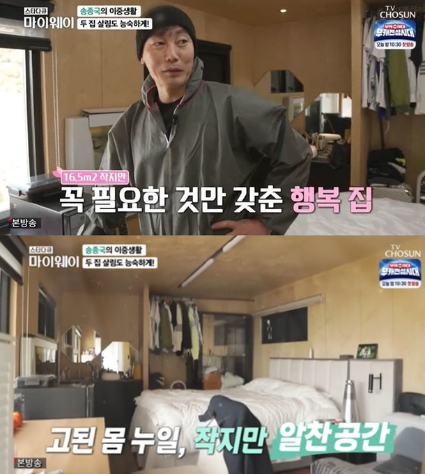 이어 자신이 머무는 5평 숙소도 공개했다. 송종국은 “5평의 행복이다. 여기서 보면 저수지, 산, 도심까지 다 보인다. 저 멀리서 들어오는 차도 다 보인다. 숙소가 거의 경비실이나 마찬가지다”라고 말했다. 그러면서 “제가 생각하기에 아무 문제가 없다. 있을 거 다 있지 않나”라고 덧붙였다.
