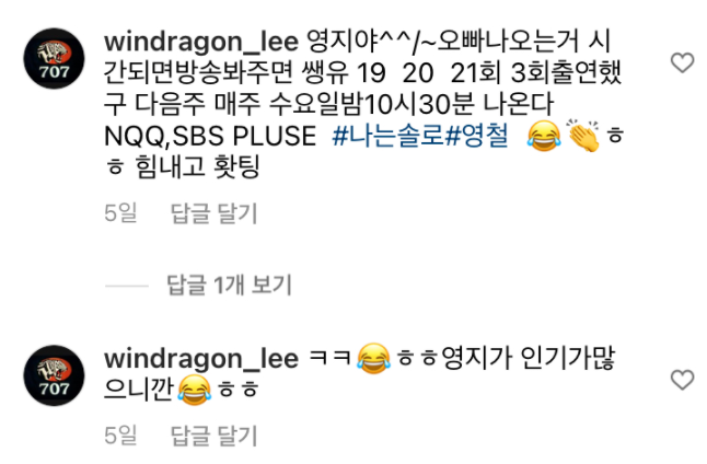 특히 영철은 어머니의 김장 모습을 올린 장동민에게 "귀염둥이 동민 친구. 같은 동갑이야. 말 놓을게"라며 "난 네 팬인데 너도 나 좀 좋아해 주라. 용기 있게 말한다. 시간 되면 방송 봐주면 고맙겠다. 19, 20, 21회 3회 출연했다"며 '나는 솔로' 프로그램을 홍보했다.