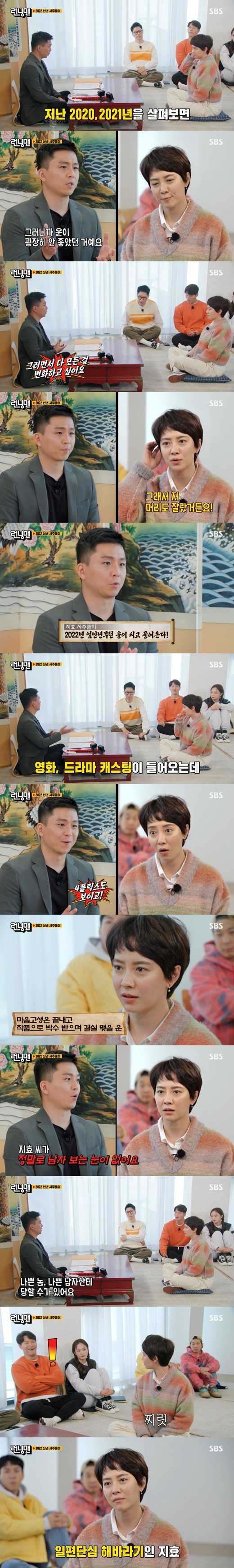 송지효의 차례가 돌아오자 역술인은 "사주를 보면 한여름에 피어있는 꽃이다. 꽃인데 너무 이쁜데 옆에 칼이 너무 많다. 그러니까 칼이 나무를 자꾸 찌른다. 지효 씨 성격이 예민하고, 자책을 많이 한다. 자존감이 한참 많이 내려가 있다. 특히 2020년, 2021년을 보면 나무가 거의 부러졌다. 운이 굉장히 안 좋았던 거다. 모든 걸 다 변화하고 싶어한다. 집도 바꾸고 싶어 한다"고 짚었다. 이를 들은 송지효는 격하게 공감하며 "그래서 머리도 잘랐다"고 고백했다.