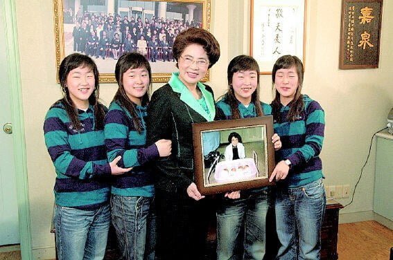 단상에 오른 황슬 / 황설 / 황솔 / 황밀 자매 가운데 첫째 슬이가 가천 길재단 이길여 회장 앞에서