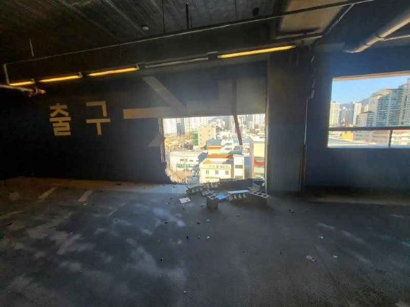건물 외벽에 큰 구멍이 뚫리며 연기 사이에서 목격된 차량은 바로 앞 2개 차로를 뛰어넘은 뒤 신호대기 중인 차량이 많은 도로로 떨어졌다. 차량 정면으로 도로 바닥에 수직으로 떨어진 차량은 한 바퀴를 굴러 뒤집혔다.
