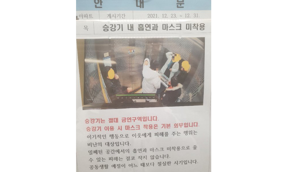 아파트 엘리베이터 안에서 담배를 피우고 마스크도 쓰지 않은 민폐 남성들 모습이 안내문에 그대로 공개돼 망신을 샀습니다.