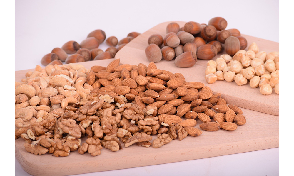 견과류에는 비 동물성 단백질이 풍부하게 들어있다. 또 심장 건강에 좋은 지방과 마그네슘, 아연 등도 많다. 아몬드와 호두, 피스타치오 등 견과류를 칼로리를 계산하며 먹으면 좋다. 하루 권장 섭취량은 1온스(약 28g)이다.