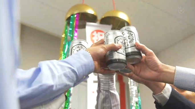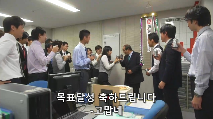 그의 영업실적 목표달성을 축하해주는 동료 직원들.