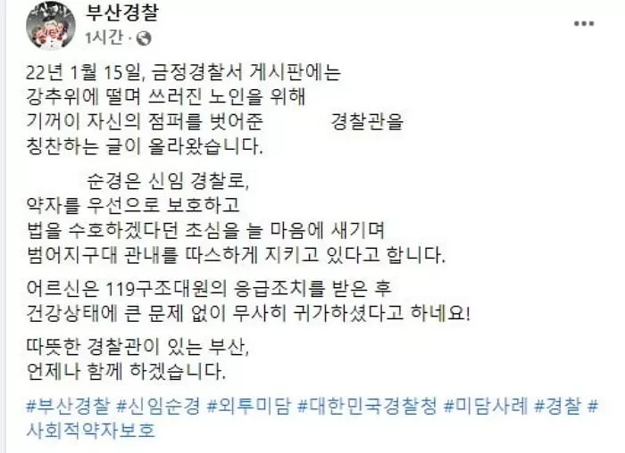 부산경찰은 "22년 1월 15일 금정경찰서 게시판에는 강추위에 떨며 쓰러진 노인을 위해 기꺼이 자신의 점퍼를 벗어준 A 경찰관을 칭찬하는 글이 올라왔다"라고 전했습니다.