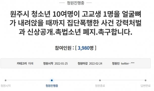 A군의 어머니는 청와대 국민청원에 '원주시 집단폭행 사건 강력처벌과 신상공개, 촉법소년 폐지를 촉구한다'는 글을 올려 "촉법소년(형사미성년자)과 소년법 폐지를 촉구한다"며 "언제까지 철없는 아이들이 아니다. 촉법소년 연령을 9세로 낮춰야 한다"고 주장했다. 이날 오전 7시 현재 해당 청원엔 4000여명이 동의했다.