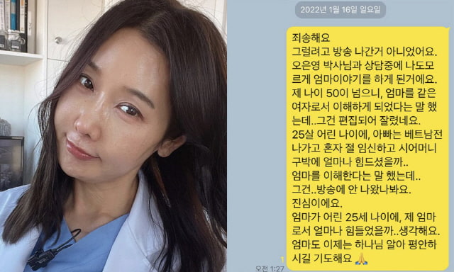 이어 "방송에서는 편집으로 잘렸는데 제가 오은영 박사님께 이런 이야기를 했다. 나이 50 넘으니 엄마를 이해한다고. 26살 때 나를 낳았고 25살에 아빠에 시집을 왔는데 아빠가 베트남전을 나갔다. 임신하고 배가 불러오는데 비가 오는데 냄비랑 밥솥이랑 둥둥 떠다니는 걸 잡았다고 한다. 혼자 외시어머니를 모시고 살았는데 그러다 우연히 신점 보는 사람이 '부자로 살겠어 남편은 돌아오겠어' 이렇게 말해서 그때부터 희망을 갖고 맨날 점을 보고 살았다"고 어머니의 젊은 날을 떠올렸다.