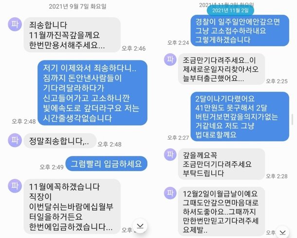 손님은 "9월엔 일을 쉬고, 11월부터 일을 시작해서 그때 꼭 갚겠다. 한 번만 용서해달라"고 A씨에게 메시지 보냈다. 11월이 되자 손님은 "이제 새로운 일자리를 찾아서 출근했다. 조금만 더 기다려달라"며 "월급날이 12월 2일이다. 그때도 안 갚으면 마음대로 하셔도 좋다"고 부탁했다.