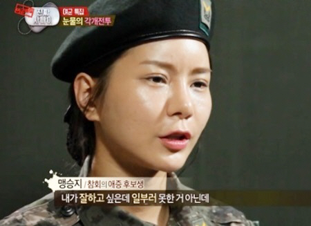 맹승지는 진짜 사나이 여군특집에도 출연하였는데요, 입소식에 배꼽티와 핫팬츠를 등장하는 등 여러 가지 당황스러운 언행을 보여주며 첫방 이후 인터넷 커뮤니티에서 악플에 많이 시달렸고, 맹승지 역시 진짜 사나이를 흑역사로 얘기하고 있습니다. 시간이 흐른 뒤 진짜 사나이에서 보인 맹승지의 모습은 소속사의 설정과 방송국의 악마의 편집 등으로 만들어진 이미지로 밝혀졌습니다.