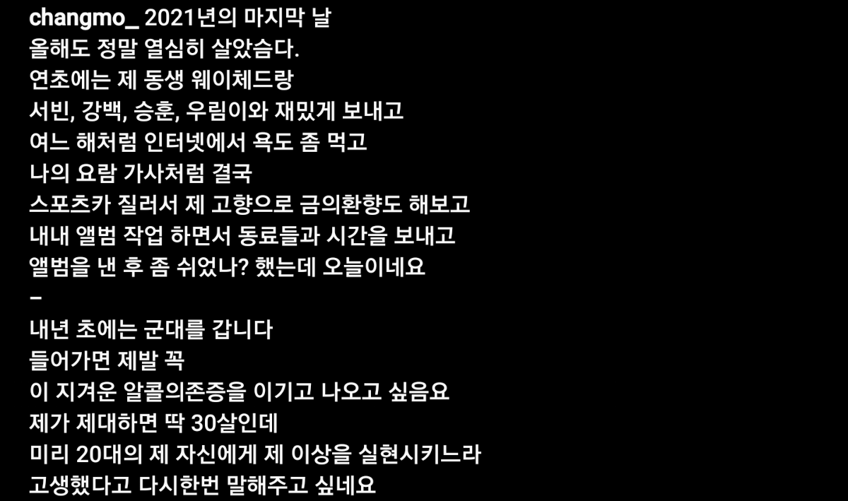 한편 창모는 지난달 자신의 인스타그램을 통해 "내년(2022년) 초에는 군대를 갑니다. 들어가면 제발 꼭 이 지겨운 알코올 의존증을 이기고 나오고 싶다" 라며 군 입대 소식을 전한 바 있다.