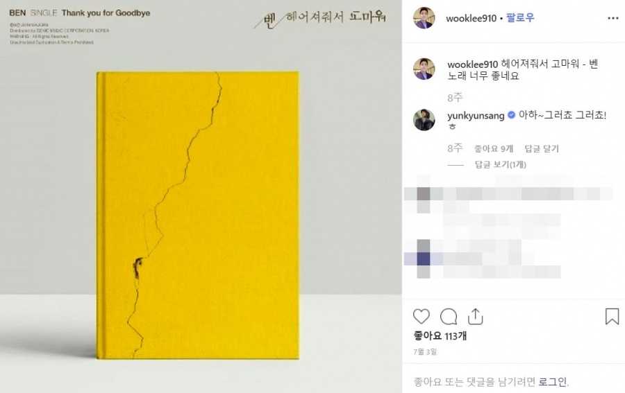 그뿐만 아니라, 이욱 이사장은 최근 벤의 신곡을 자신의 SNS에 홍보하는 등 애정을 나타내기도 했다. 이욱 이사장은 자신의 인스타그램에 벤의 앨범 커버와 함께 "'헤어져줘서 고마워' 노래 너무 좋다"고 글을 남기기도. 눈길을 끄는 것은 배우 윤균상이 해당 게시글에 "아하. 그렇죠"라는 댓글을 남겨, 윤균상이 두 사람의 열애를 일찌감치 알고 있었냐는 누리꾼들의 추측이 나오고 있다.